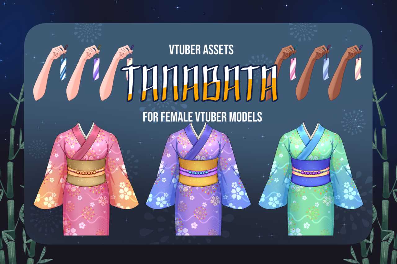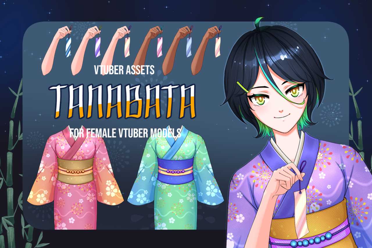 Tanabata VTuber PNG Assets – Female Yukata Outfit & Tanzaku Wish Papers (Festival Set)