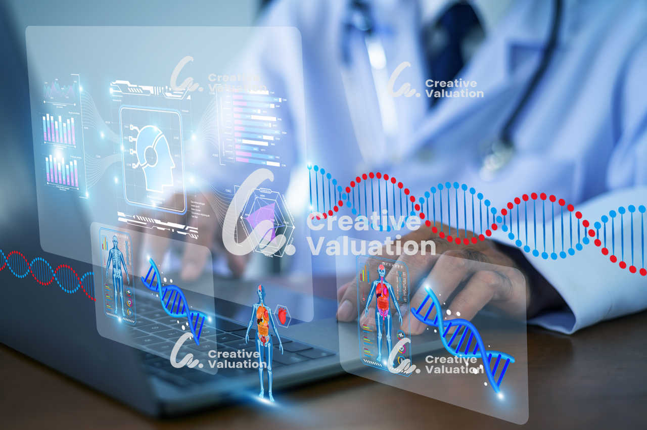 AI-powered medical interface analyzing DNA and patient data to improve biotechnology innovation, diagnostics, and health research accuracy
