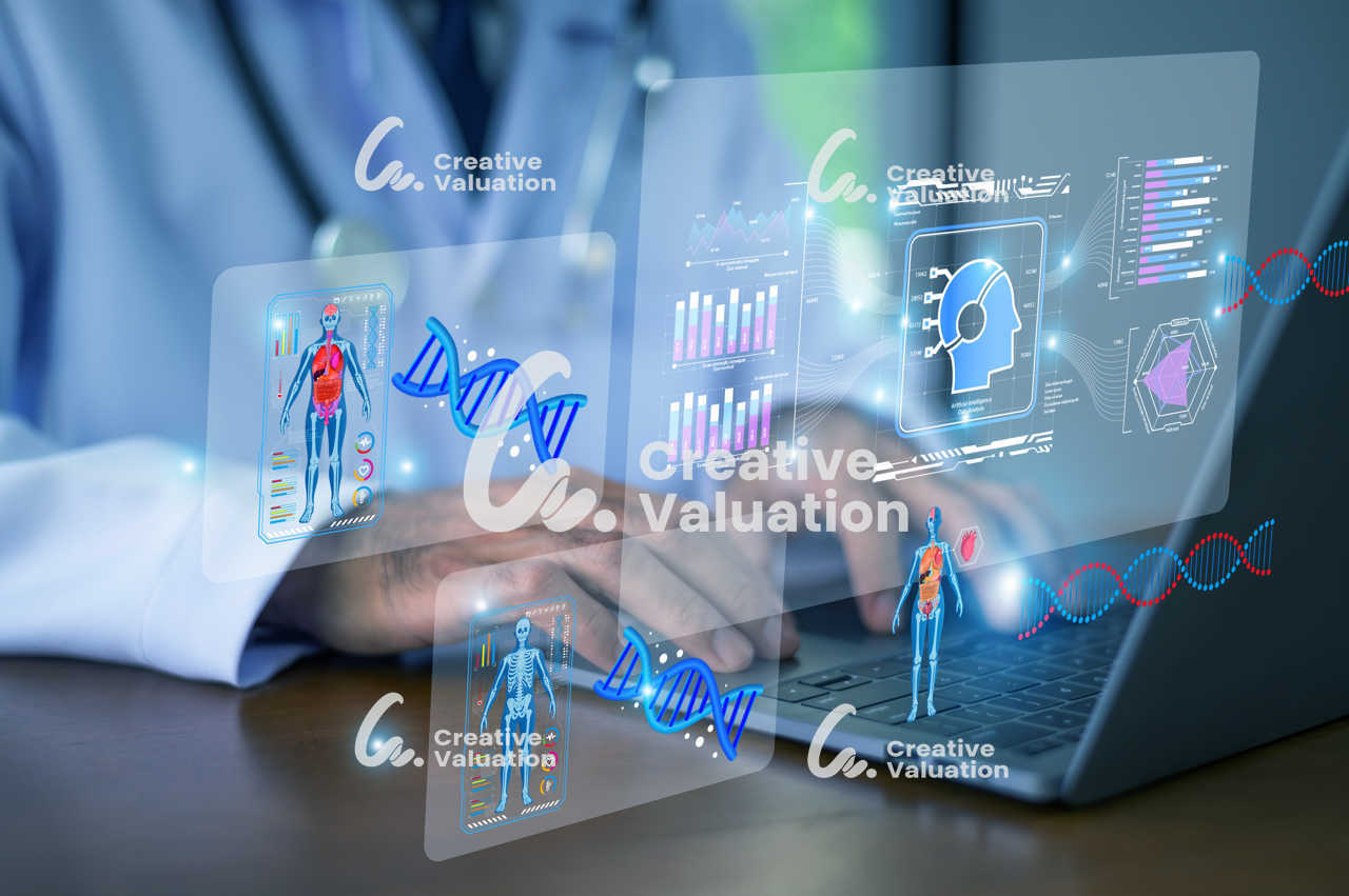 AI-powered healthcare data interface displaying biotechnology metrics, DNA visualization, and advanced digital diagnostics for modern medical research