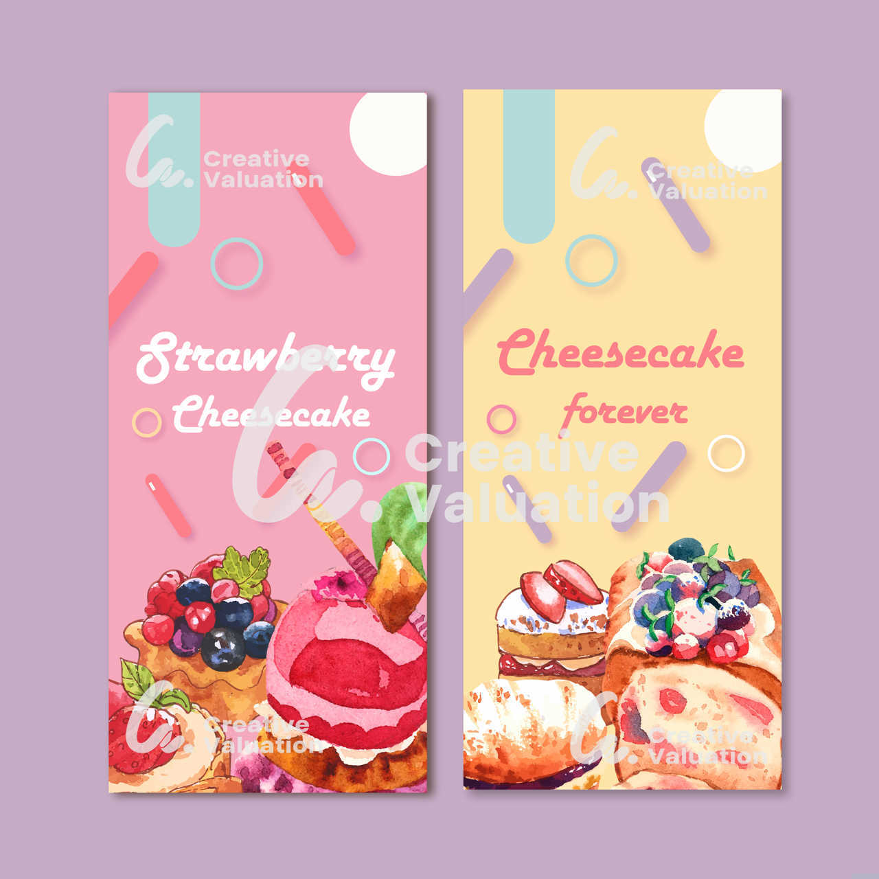 Dessert flyer design with strawberry cheesecake creative watercolor illustration.
