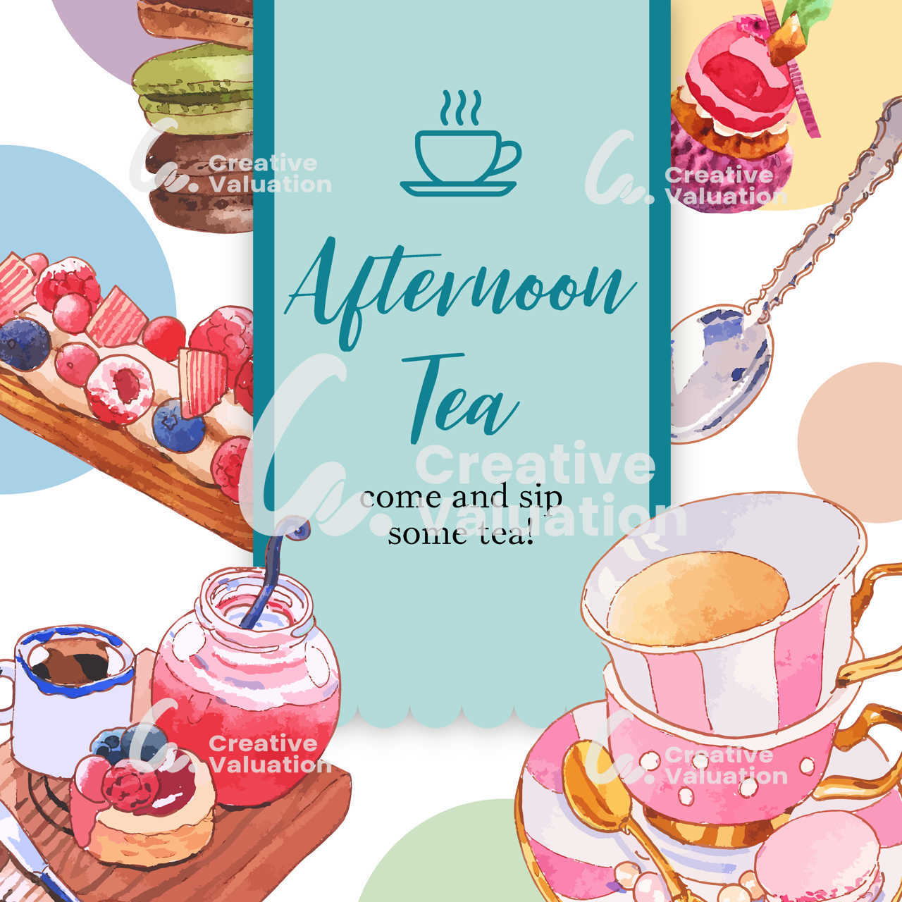 Dessert frame design with cupcake, macarons, tea cup watercolor illustration.