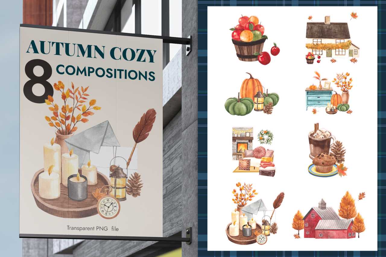 Autumn Cozy, Home warmly with hot chocolate, maple, candle and dessert Watercolor